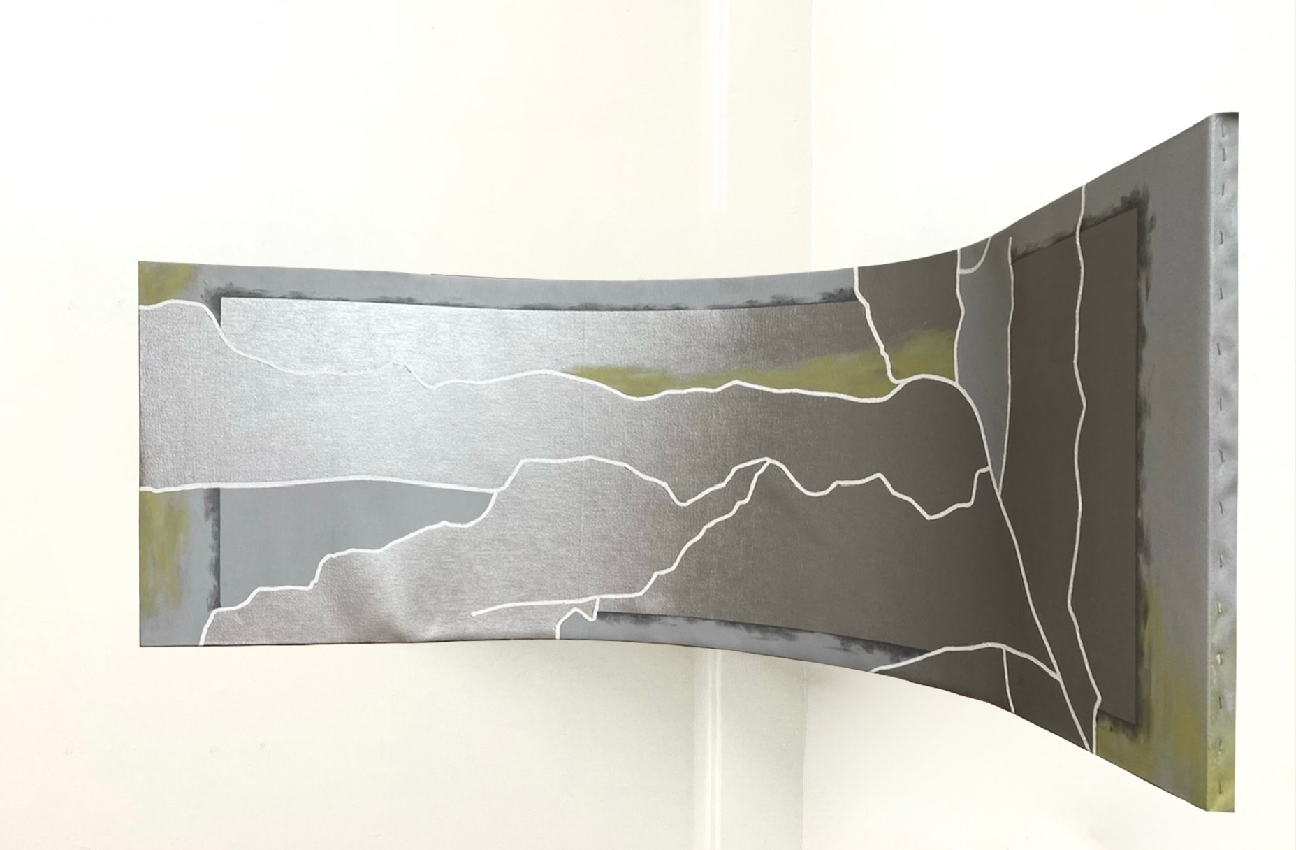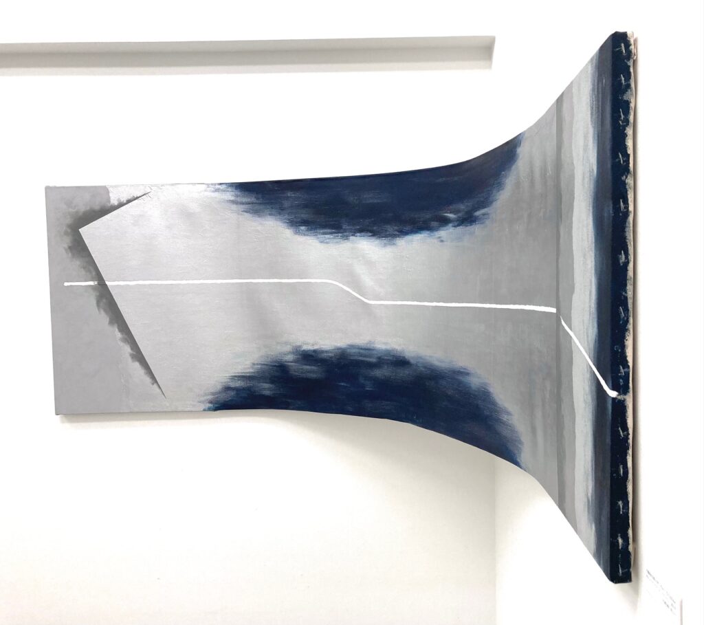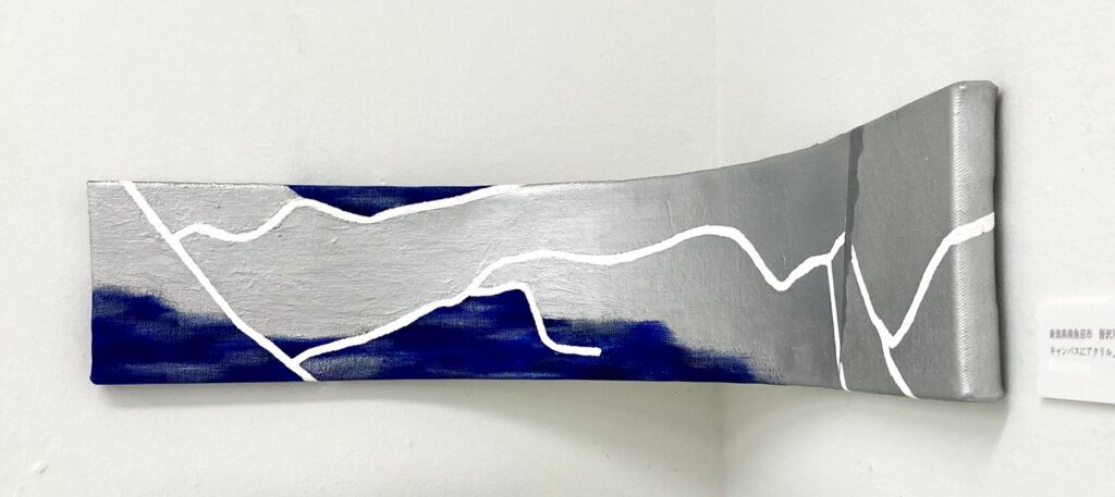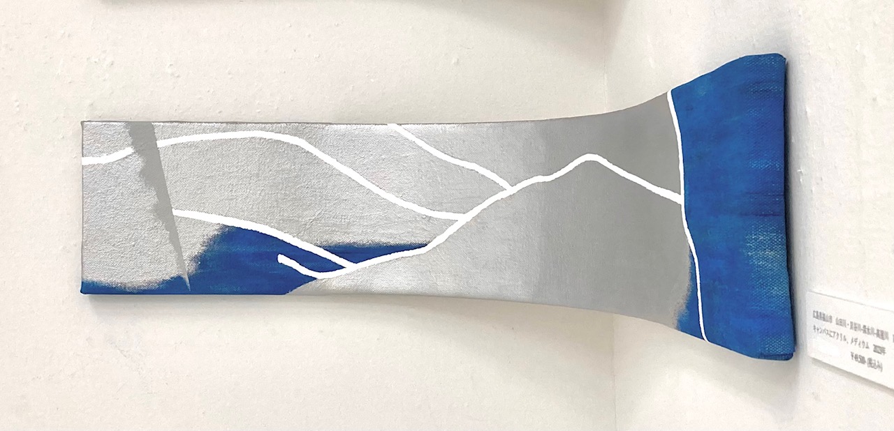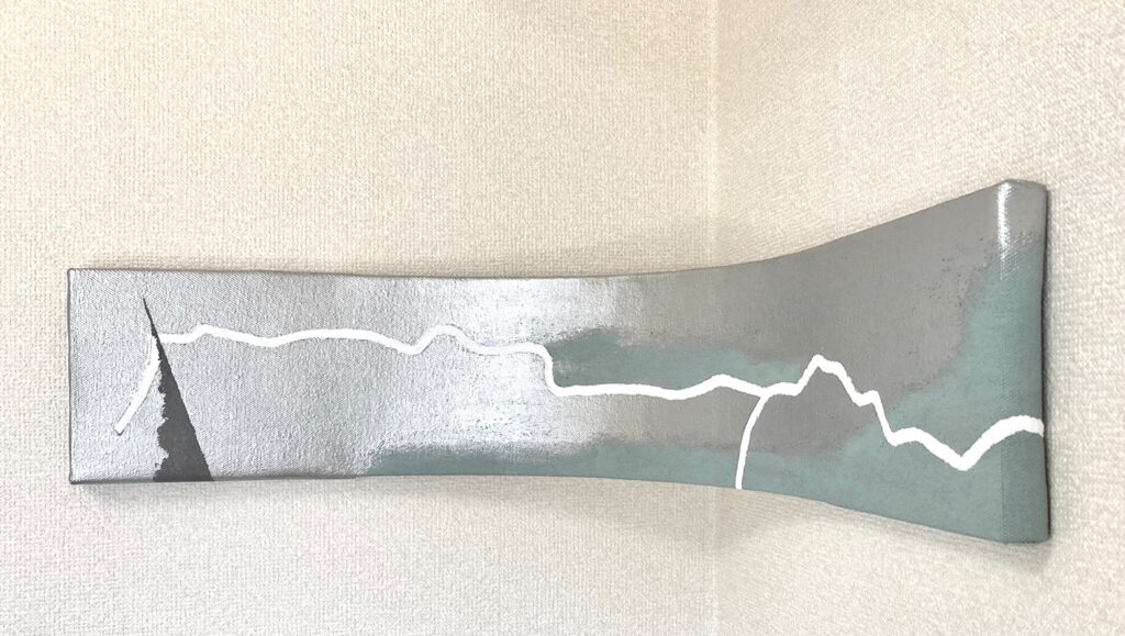 ①光沢色であるシルバー を使用し、更に作品を湾曲させる事により、観る角度や光の照らす角度によって “観え方が変わる作品”