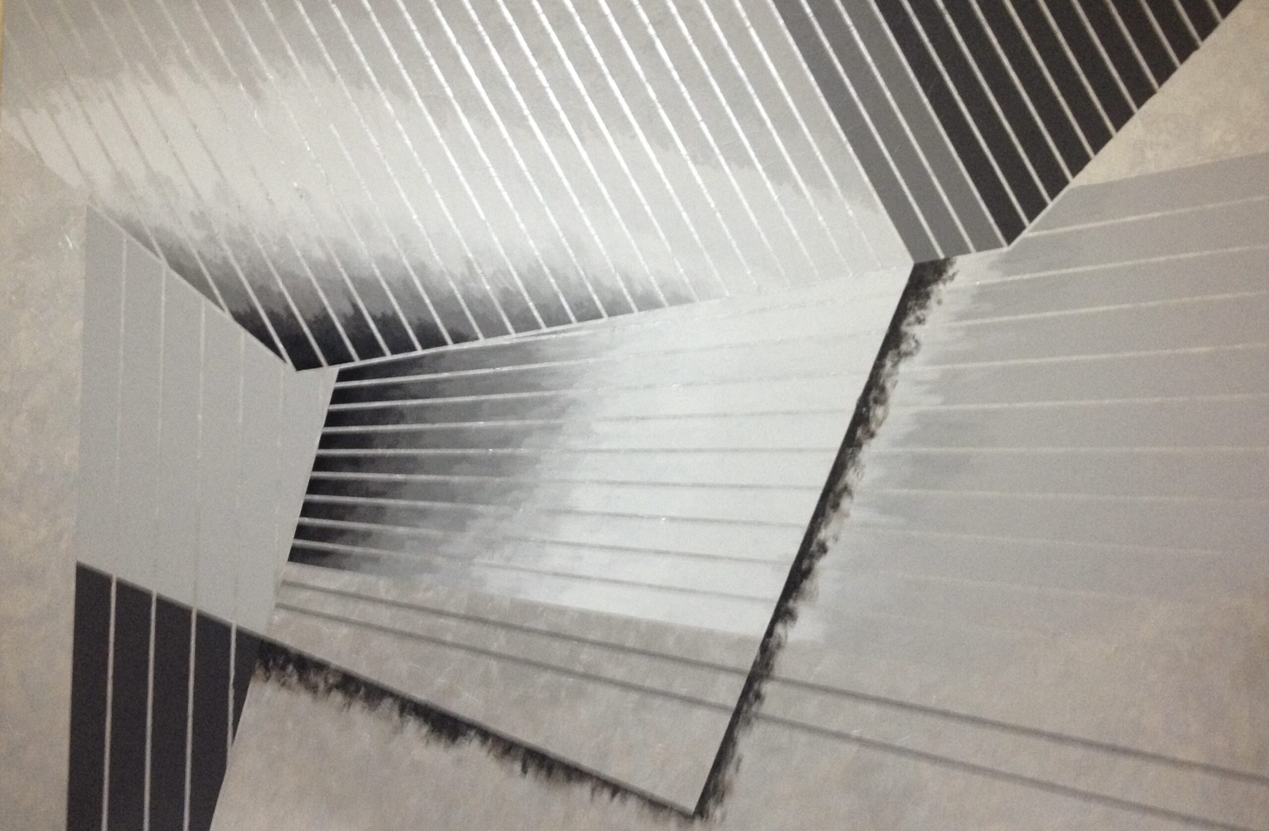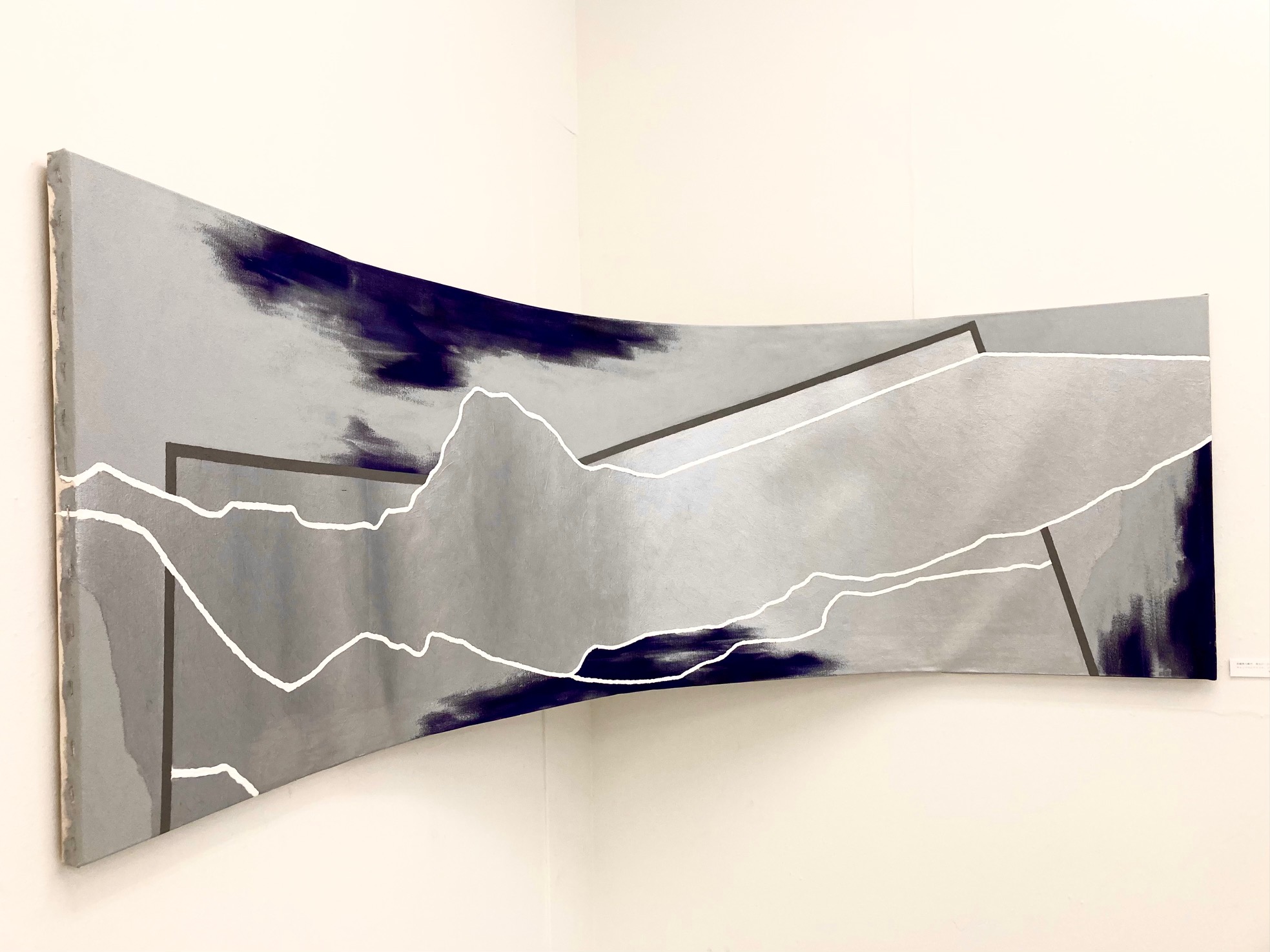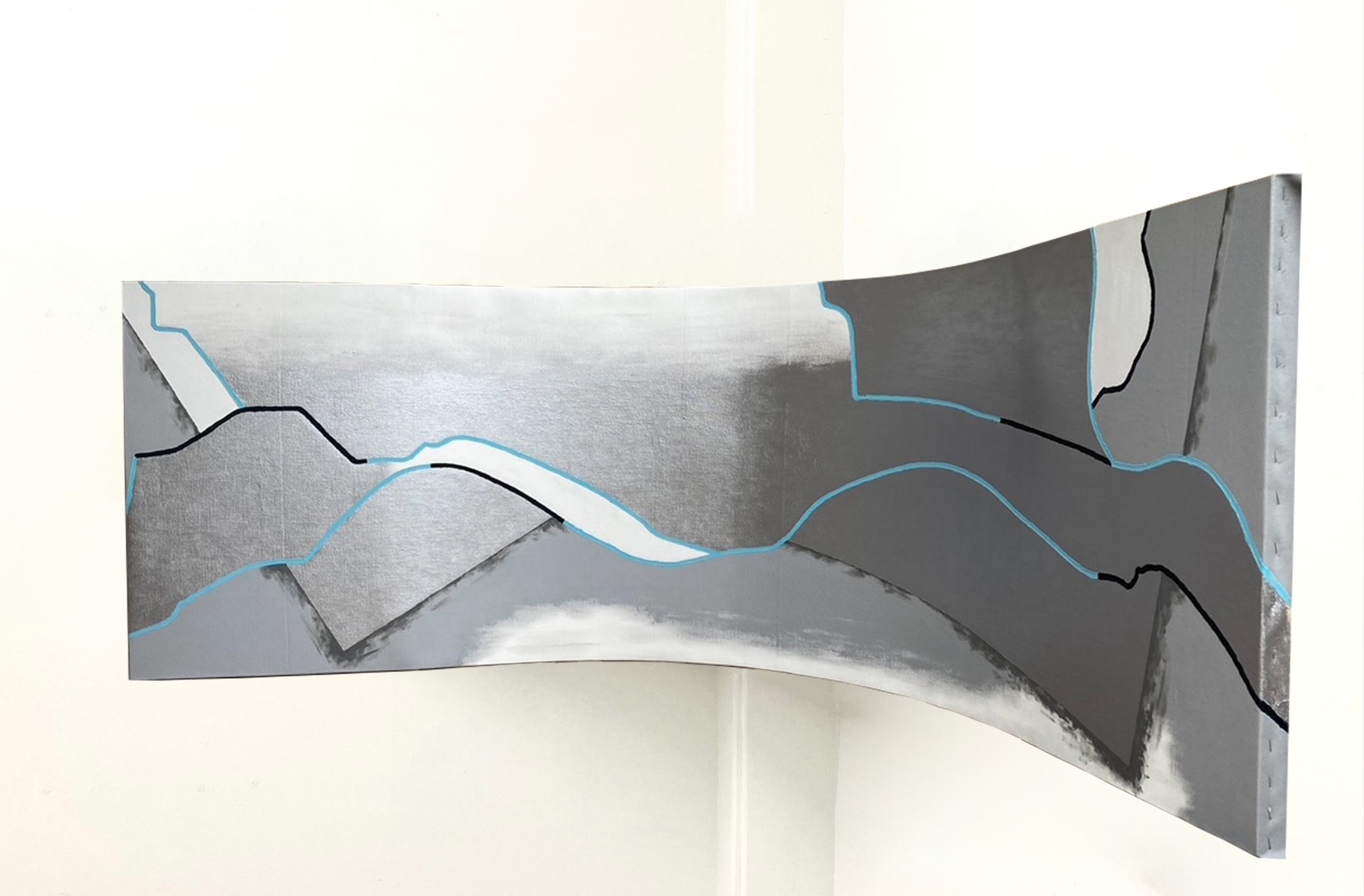 ①光沢色であるシルバー を使用し、更に作品を湾曲させる事により、観る角度や光の照らす角度によって “観え方が変わる作品”